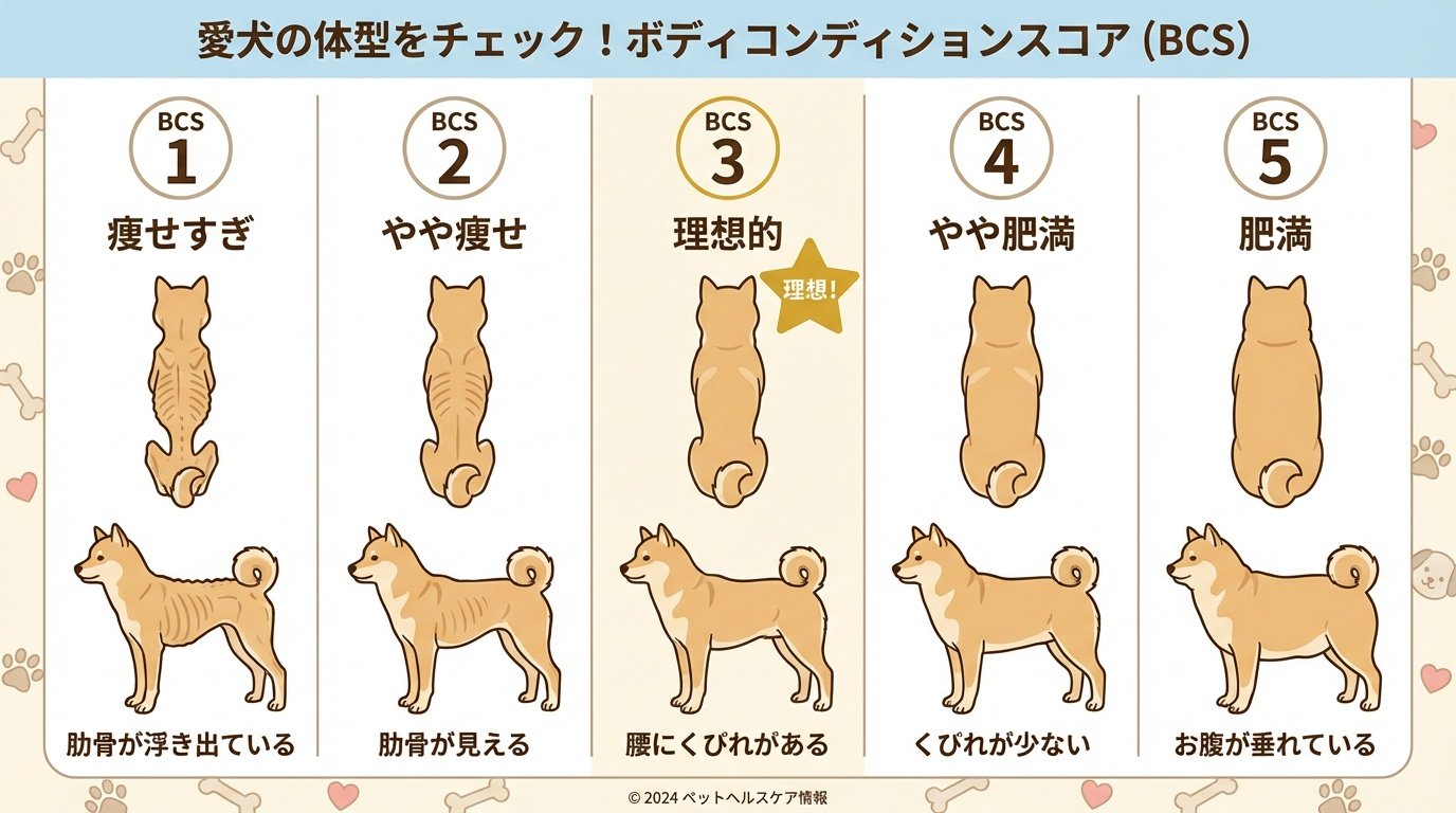 ステップ1で算出した量が本当に愛犬に合っているか、その答えは愛犬の体が教えてくれます。そのための客観的な指標が「ボディコンディションスコア(BCS)」です。これは、見た目と触り心地で体型を5段階で評価する方法で、世界中の獣医師が使っています。