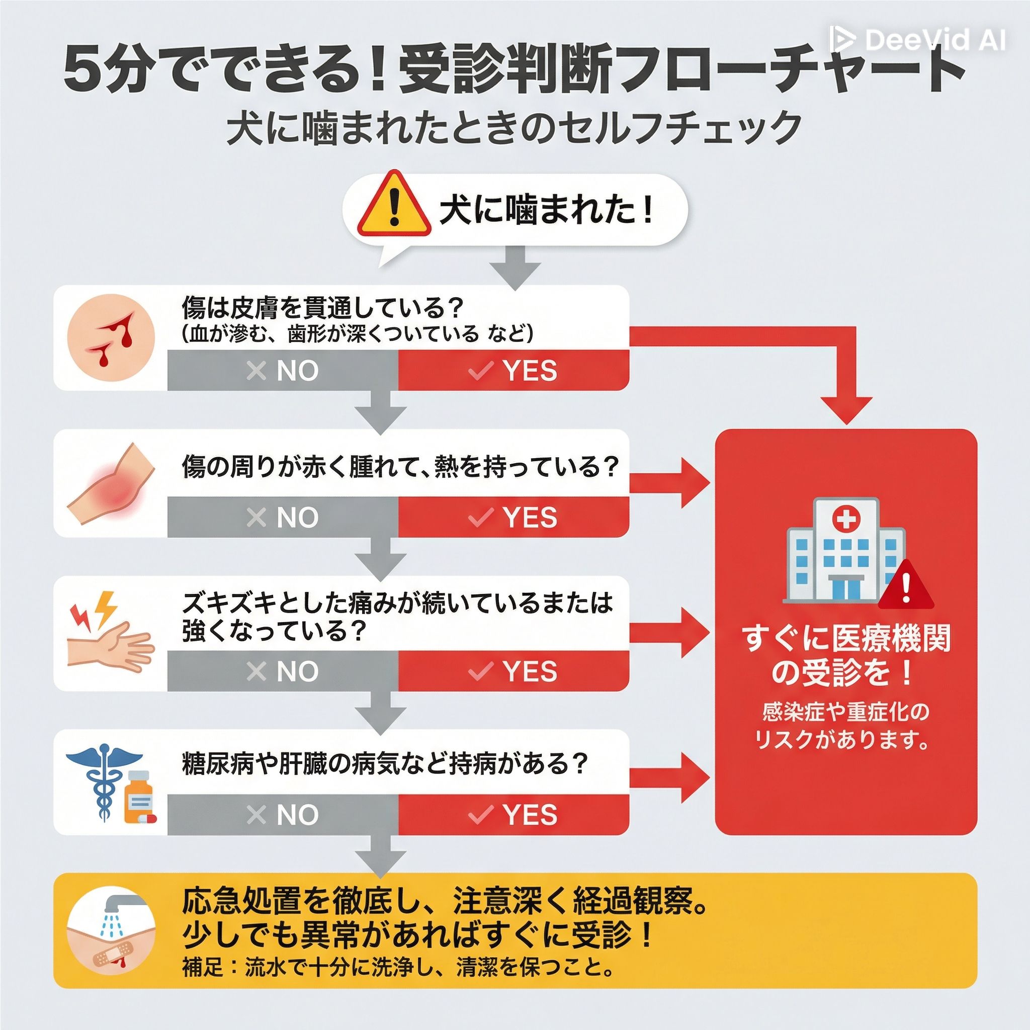 - 次の行動: フローチャートで一つでも当てはまれば、あるいは少しでも不安があれば、迷わず病院へ。
