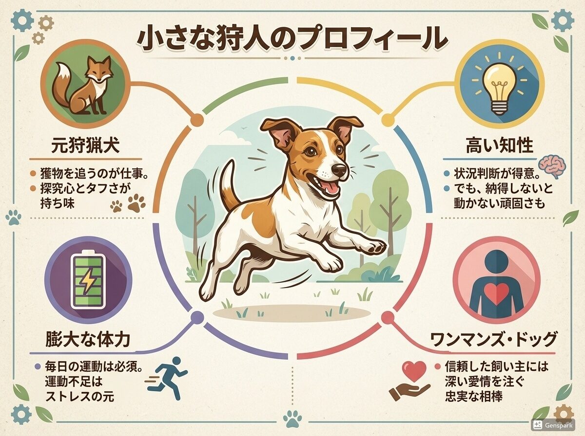 ジャック・ラッセル・テリアは、19世紀のイギリスで、キツネ狩りのために作られた狩猟犬(テリア)です。この「何のために作られたか」という歴史的背景が、その犬の気質や行動を決定づける、いわば設計図のようなものなのです。